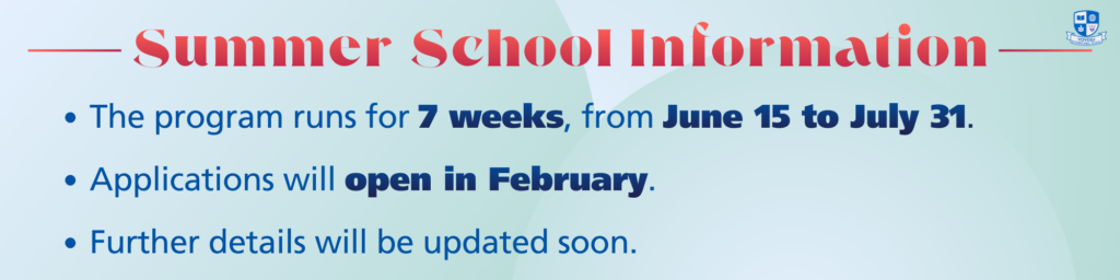 Our Summer School will run from June 15 for 7 weeks until July 31.More information will be updated. -