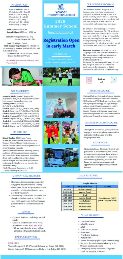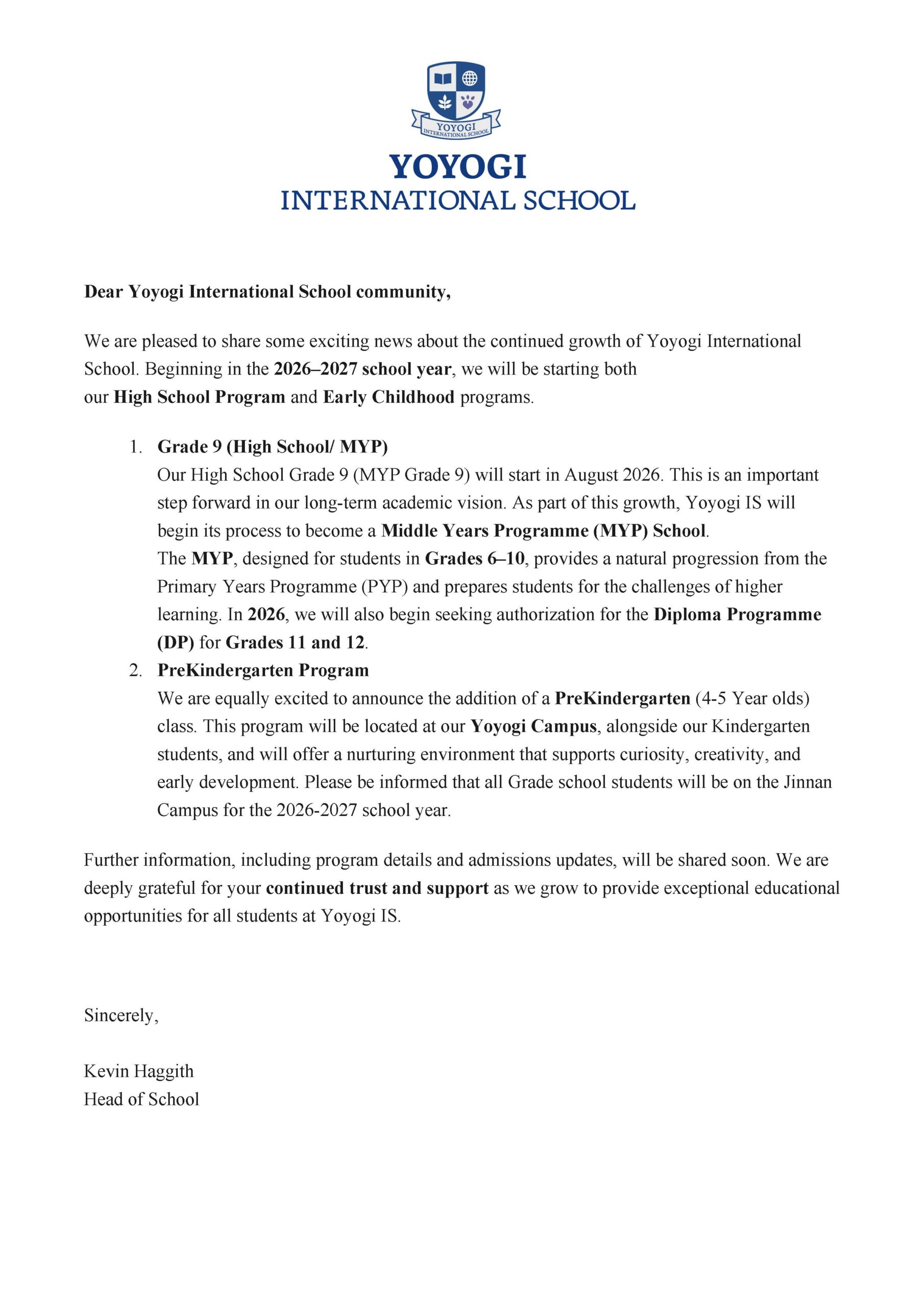 We are pleased to share some exciting news about the continued growth of Yoyogi InternationalSchool. Beginning in the 2026–2027 school year, we will be start… -